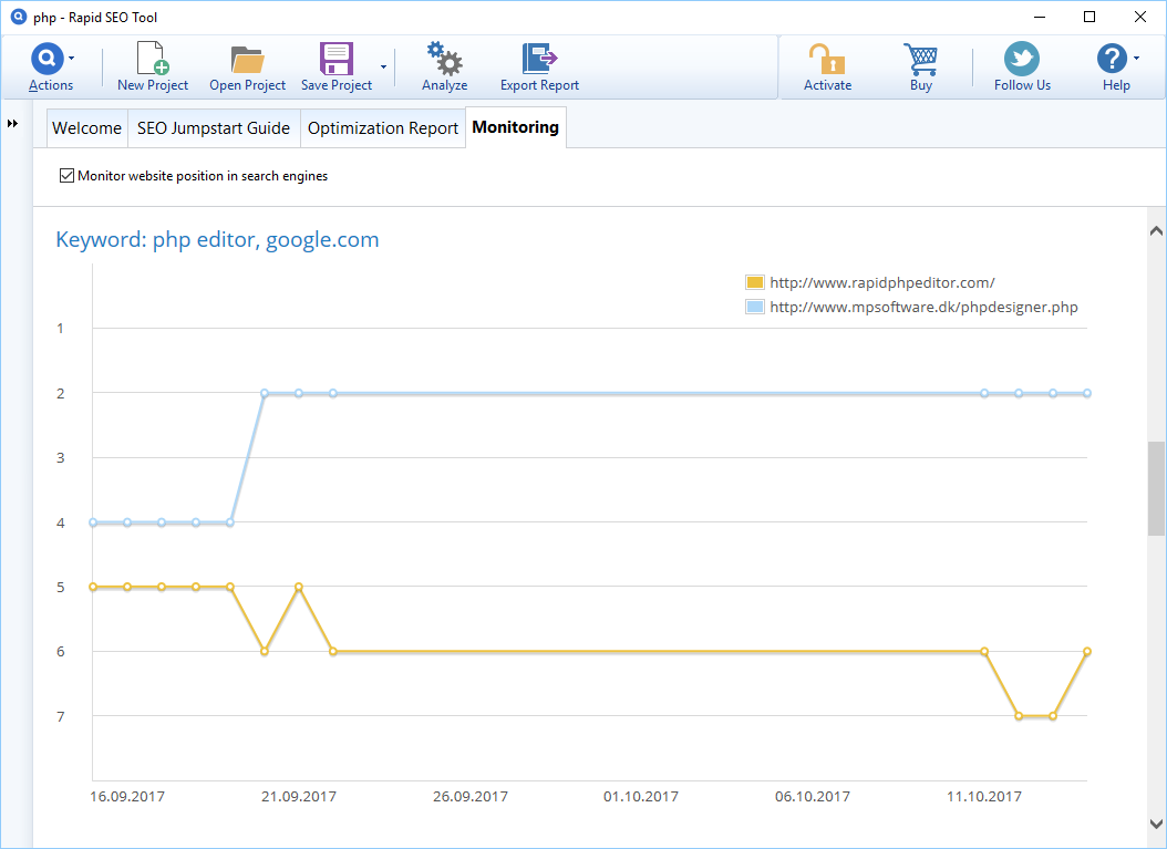 Rapid SEO Tool vous propose une comparaison côte à côte révolutionnaire que vous ne trouverez dans un aucun autre logiciel de référencement. Rapid SEO Tool vous permet en plus de produire des rapports complets en moins d'une minute. Pas de longues configurations ou d'assistants de création de projet.