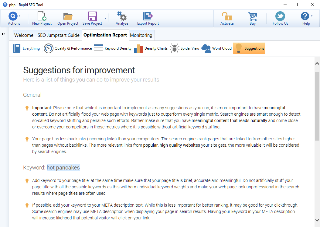 Contrairement à d'autres outils de référencement et analyseurs de densité de mots-clés, Rapid SEO Tool n'est pas un outil de bourrage de mots-clés, mais plutôt un outil de comparaison.