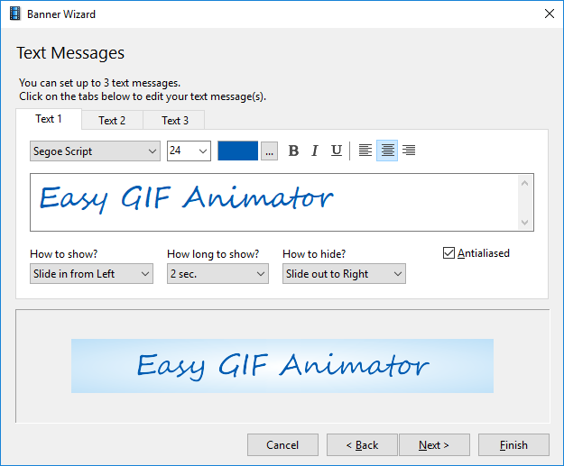 Create, edit and modify your GIF animation images directly from Easy GIF Animator. You can draw lines and shapes, paint image areas and even add text with a shadow.