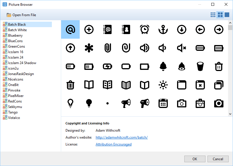 You can easily add icon images to your buttons and menus. Various icon formats are supported. Hundreds of free icons are included.