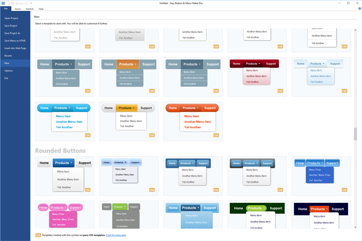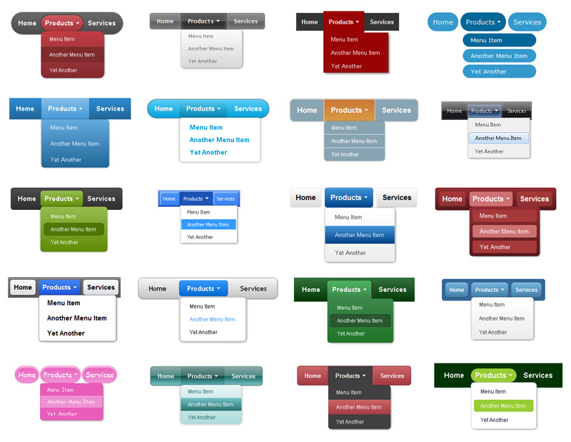 Hundreds of very cool button and menu design templates are included. This image demonstrates just a few samples from hundreds of included and millions of possible combinations.
